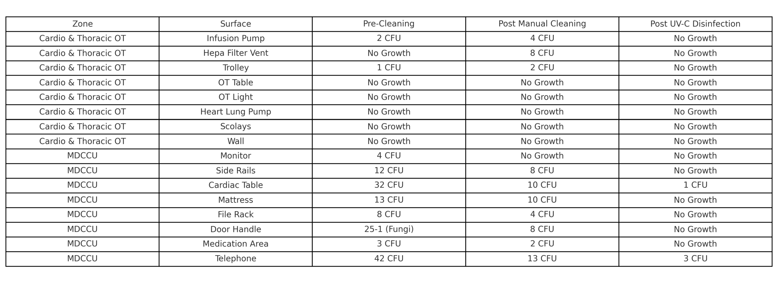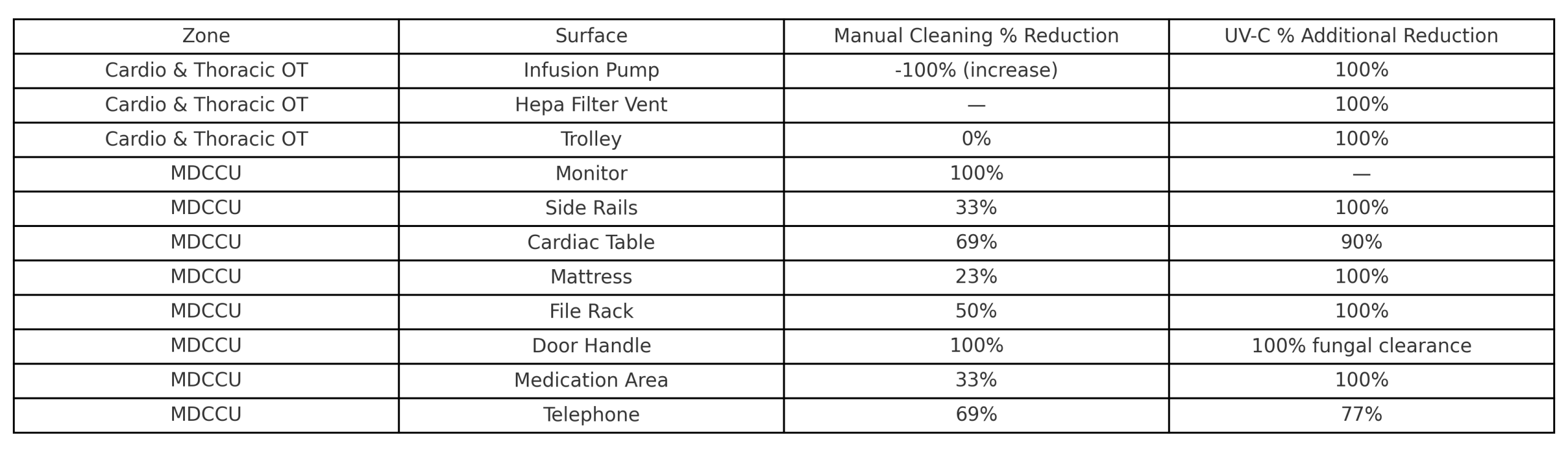 This study compares the effectiveness of manual disinfection versus a combined approach incorporating UV-C light, using percent reduction in microbial contamination on selected high-touch surfaces. It also highlights the risks of non-compliance with SOPs during manual cleaning.